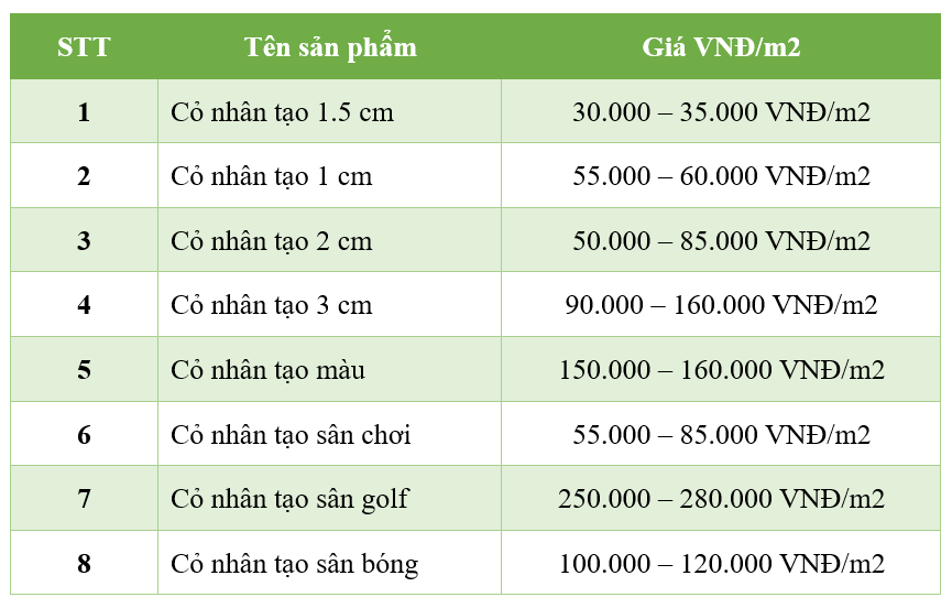 Để tạo ra một không gian sân vườn đẹp, hãy khám phá Bảng giá thảm cỏ nhân tạo sân vườn dưới đây để biết chi tiết về giá cả và các loại sản phẩm của chúng tôi: