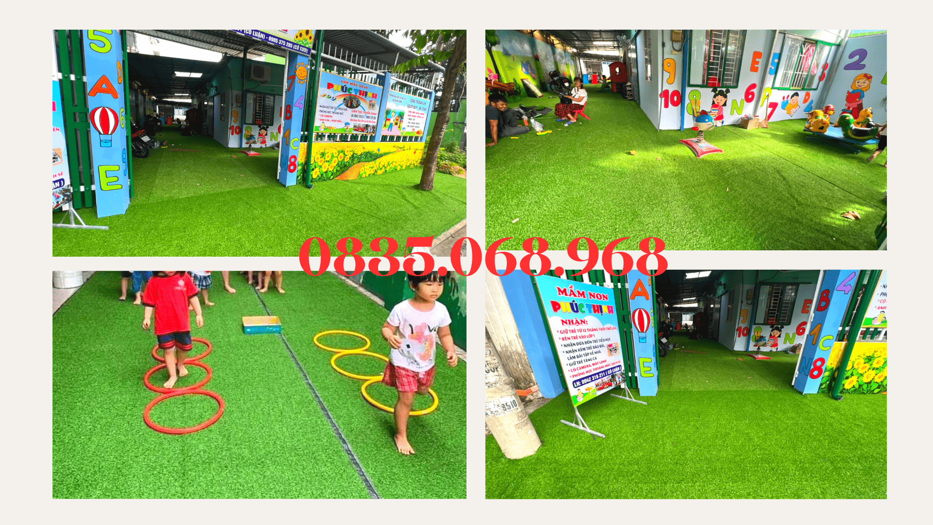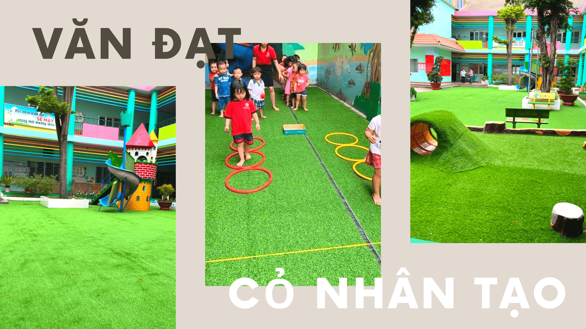 Cỏ nhân tạo Văn Đạt cung cấp đầy đủ các loại cỏ từ cỏ Giải trí mềm đến cỏ Thể thao. Giờ đây, nhiều màu sắc và hình dạng khác nhau có thể được triển khai một cách hiệu quả để đóng vai trò là công cụ hỗ trợ giảng dạy và tăng sức hấp dẫn đối với trẻ em khi sử dụng chúng. Chúng tôi cung cấp một loạt các giải pháp bề mặt sân chơi và sàn sân chơi cho các trường học và nhà trẻ trên khắp Bình Thuận.